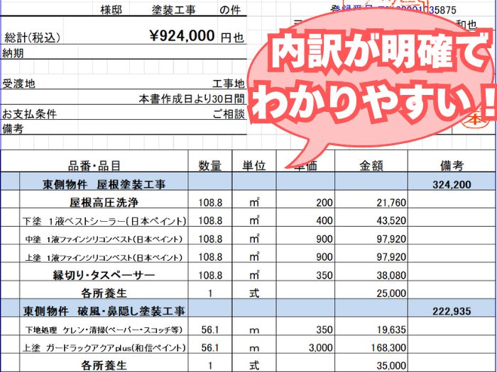 - 見積書の透明性:塗料名、工程、補修費など「一式」表記を避け、内訳が細かく明確か。