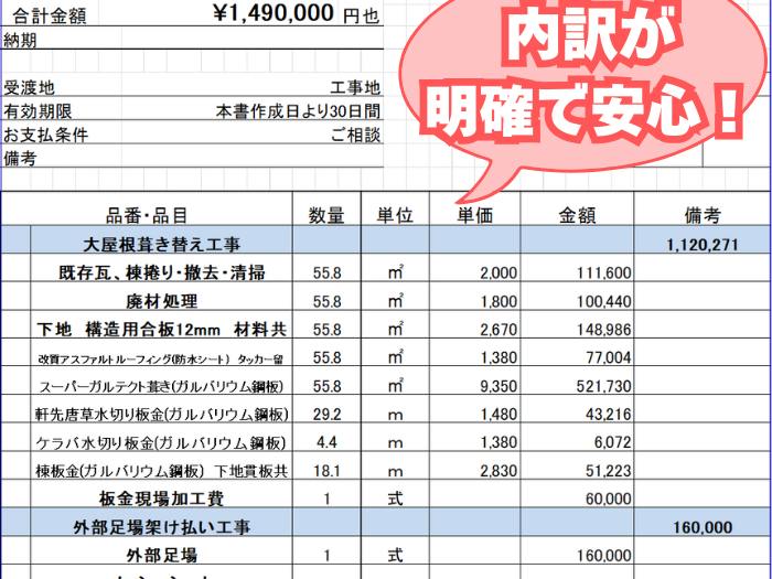 ※上記の金額は、足場代、既存材の撤去処分費、防水シート、新屋根材、施工費をすべて含んだ目安です。