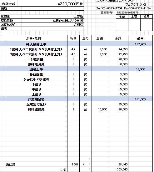 | 諸経費・消費税含む総額 | ー | ー | ー | 340,000円(税込) |