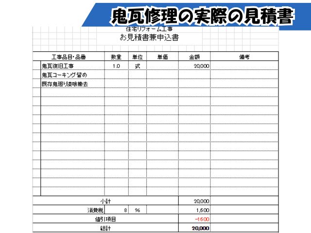 | 鬼瓦復旧工事 | 1.0 | 式 | 20,000円 | 20,000円 | 落下またはズレた鬼瓦を清掃・角度調整し、銅線や漆喰などで再固定する作業。 |