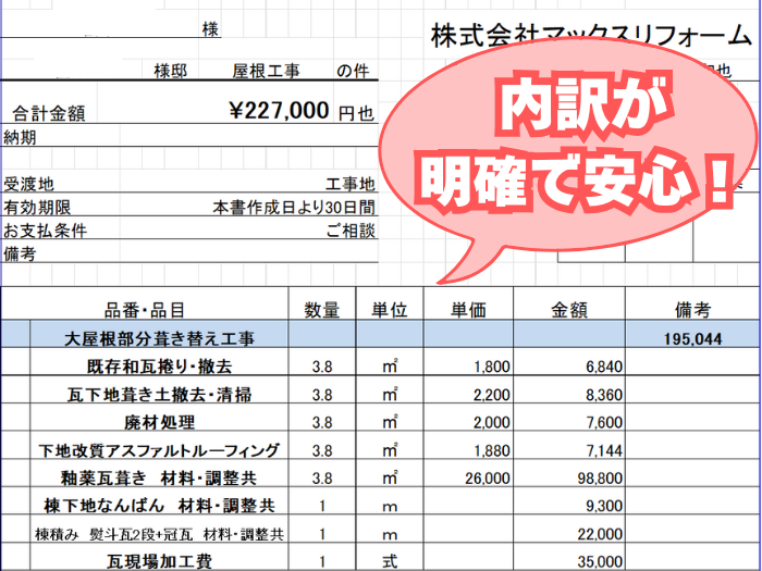 - 見積書の内訳の透明性: 材料名、数量、単価、工程が詳細に記載されているか。「屋根工事一式」といった不明瞭な表記を避けているか確認しましょう。